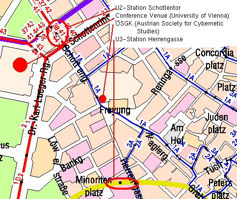 The Austrian Society for Cybernetic Studies (ÖSGK) is located nearby the University (2 minutes walk). Its address is "Freyung 6/6". The ÖSGK is within walking distance of the subway station "Schottentor" of the U2 subway. Walk down the Schottengasse from this station until Freyung, then go through the big door and enter the courtyard. On the left side there is a door with the number 6. ÖSGK is on the third floor (no elevator).